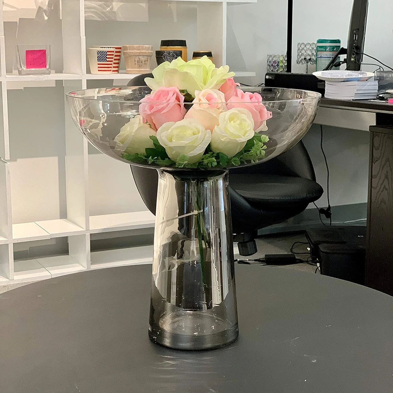 Each center plate includes a top portion consisting of a wide bowl with short sides. The rim measures 13.5” around to provide a spacious opening to add items. The sides curve downward, ending at the top of the matching stand. The stand is just as smooth and luxurious, with a slightly wider bottom that sits flush on the tabletop. The wider size and elevated design makes this a great choice when building wedding centerpieces or focal point displays.