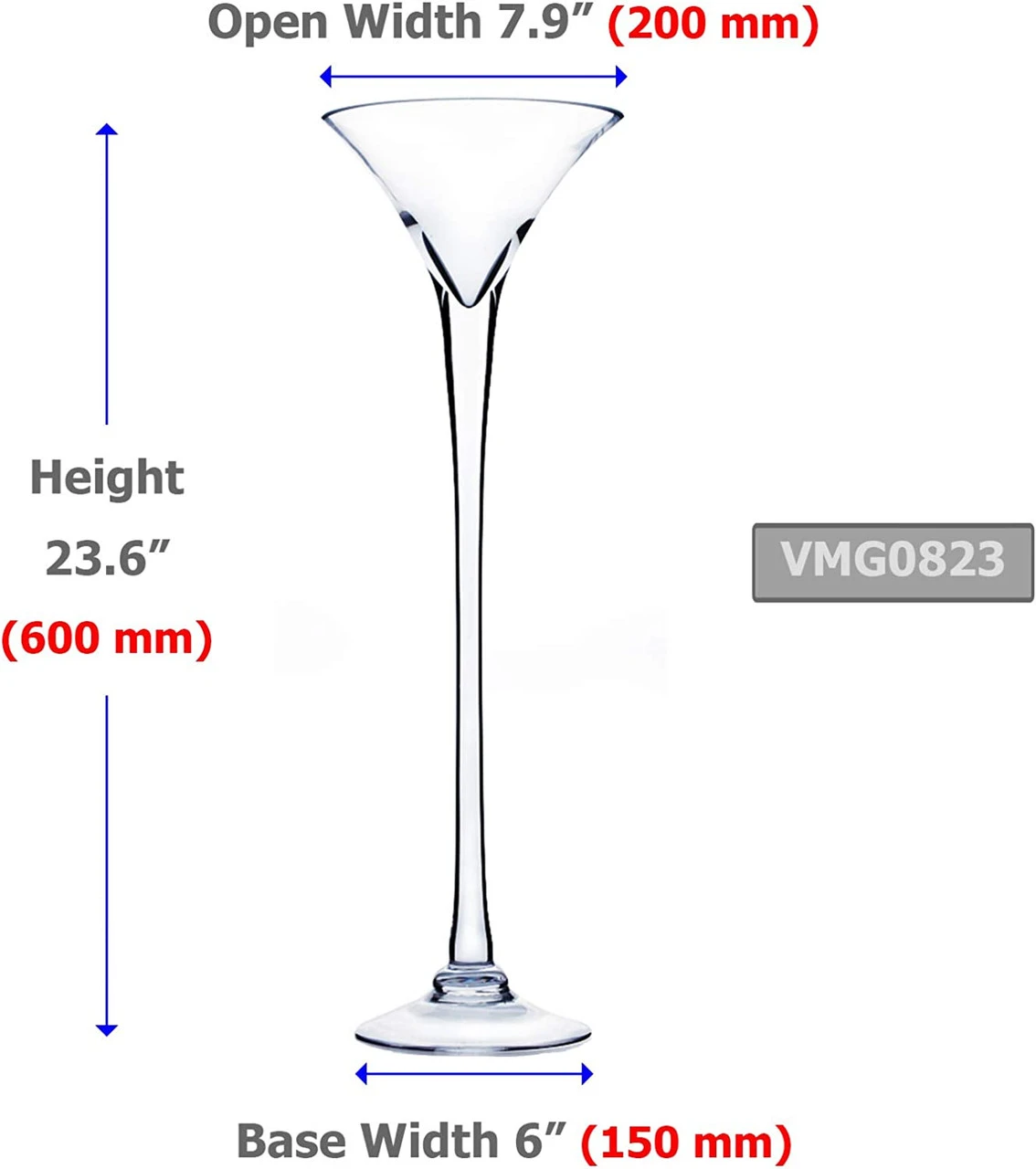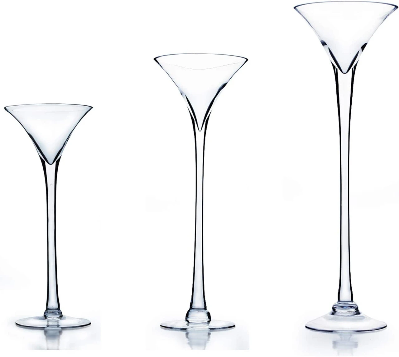 Each martini glass vase is topped with a cone shaped top that’s round with a wide rim that measures 8”. The smooth sides angle down, forming a solid, straight stem. The stem is attached to a clear disc of glass at the bottom, forming a 6” base. The entire piece stands 23” tall, making it a good option when looking for a base for a wedding centerpiece.