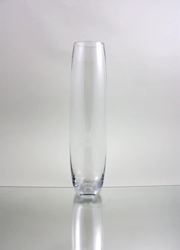The bottom includes a thick disc of glass that provides weight and sits flat on the tabletop, counter, shelf or any other sturdy surface. The sides extend up to give the piece a 16″ height, ending with a 3″ opening on top. Unlike our cylinder products, this container has an even middle with tapered ends. The top and bottom slopes in gently, giving it a sleek bullet-like profile that is not often found in glass décor.