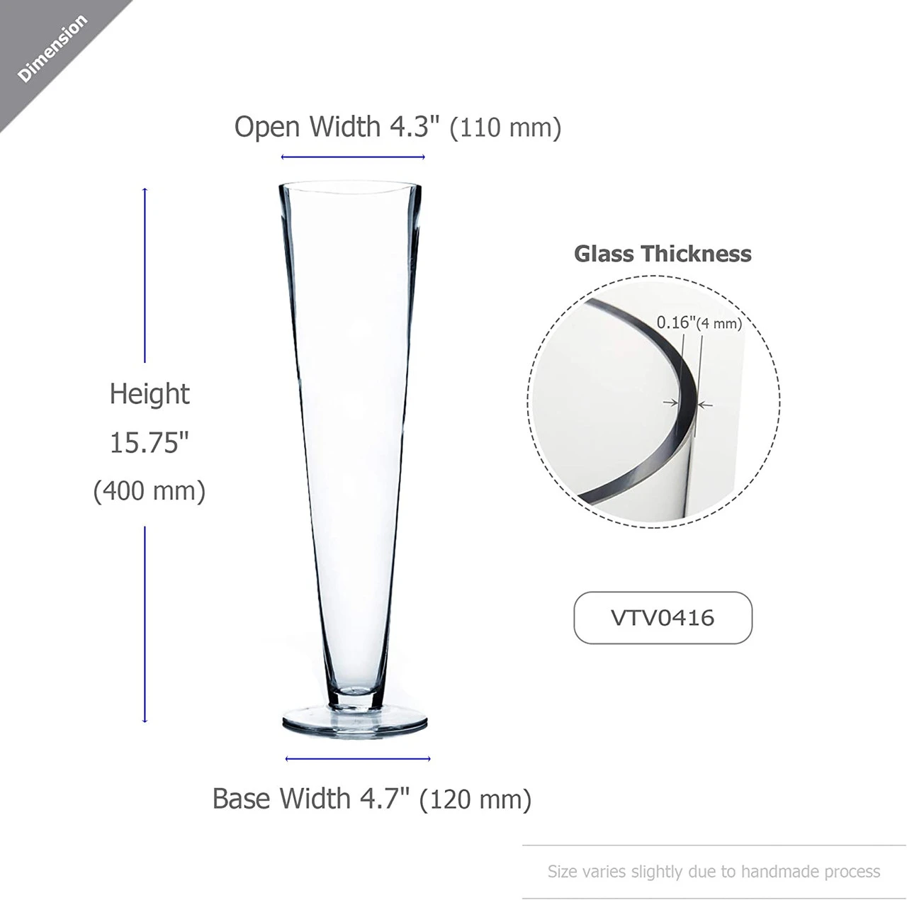 This glass vase stands 16”. It’s a great size for a wedding centerpiece yet small enough to work as accent décor. The bottom is round and sits flat on the table top. The disc rises to form a hollow column of glass that widens as it rises. The tapered look is very elegant and offers a more distinctive profile than a basic cylinder vase. Our 16” trumpet vase is available in case quantities of eight.