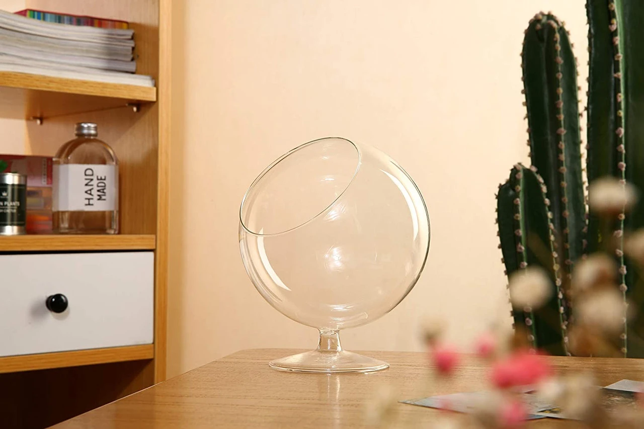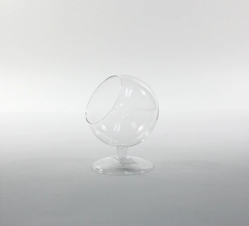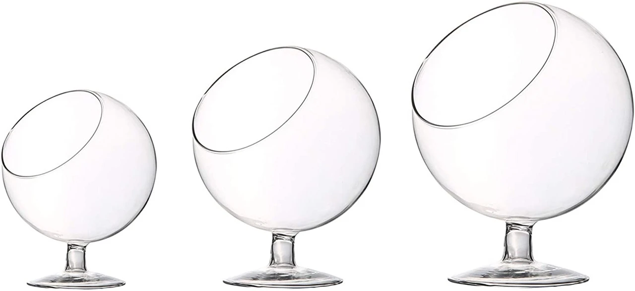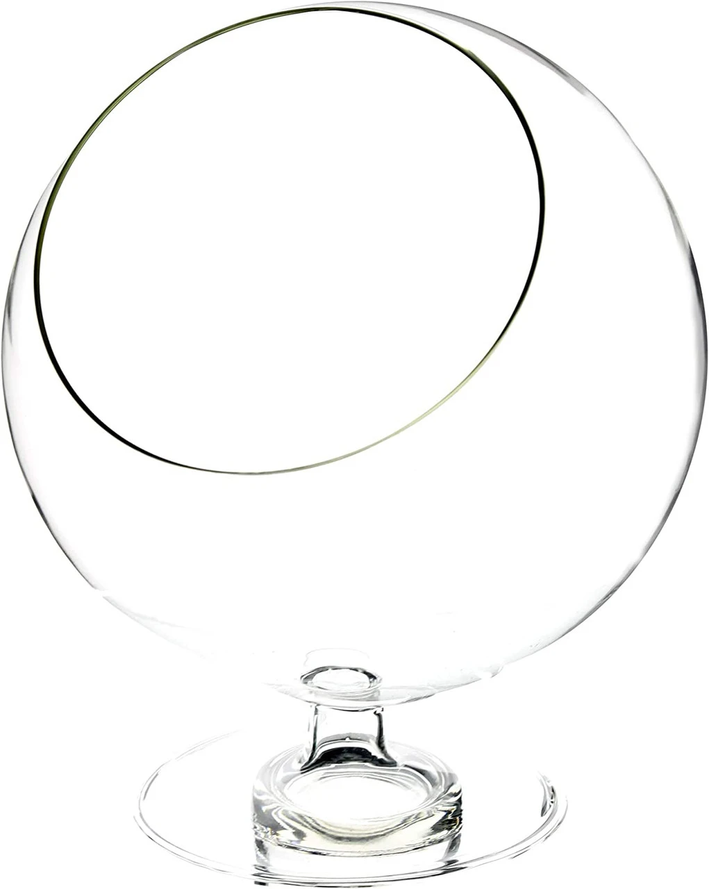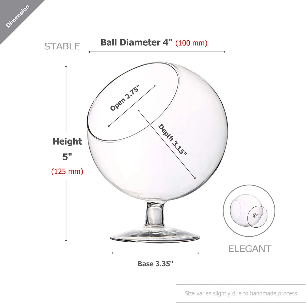 This version measures 4” by 5”. We also carry two other sizes that feature the same exact shape and arrangement. Use just one size or combine multiple to create a custom look for your venue. Each includes a disc shaped base that is reminiscent of a wine or champagne glass. A short neck rises up to support a hollow orb of clear glass. A round opening appears along one side so you can add whatever you like to the interior!