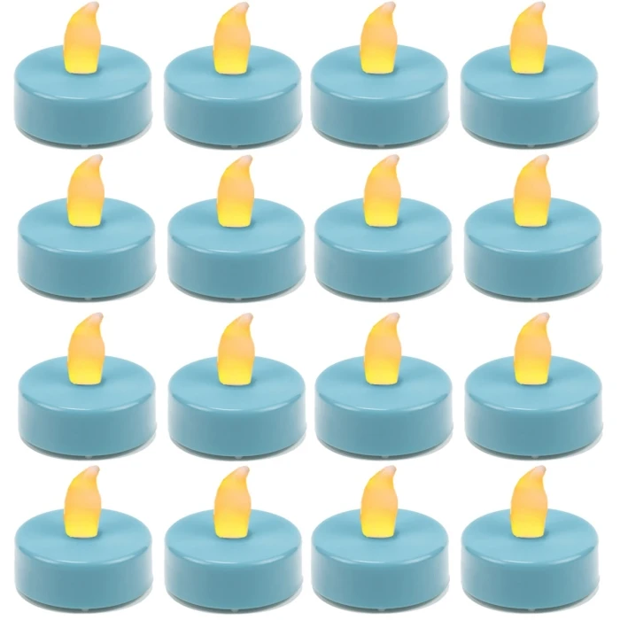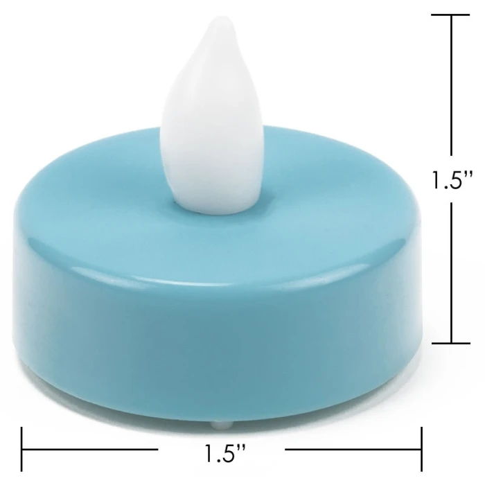 Flameless LED Tealight Candles, blue casing, battery operated – Height: 1.5″ | Width: 1.5″ – Flickering soft amber LED light realistically simulates burning candle flames. These flameless tea lights have no drips, no mess, and is to use safe around children or pets. Each candle has an On/Off switch and uses one CR2032 Battery (included); easily replaceable by a push button. Batteries last up to 100 hours compared to only 7 hours sold in other online sites. These candles make great and affordable party favors and gifts, especially for kids!