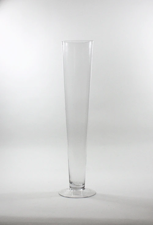 Each trumpet vase rests on a disc of clear glass. Rather than form a solid neck, the actual bowl begins right at the center of the base. Round walls rise up, widening as the near the top to form a dramatic trumpet shape. The rim is smooth so the vase is easy to handle during setup and cleanup. This version stands a lofty 24” tall so it will definitely get noticed when used as the focal point of a wedding centerpiece.