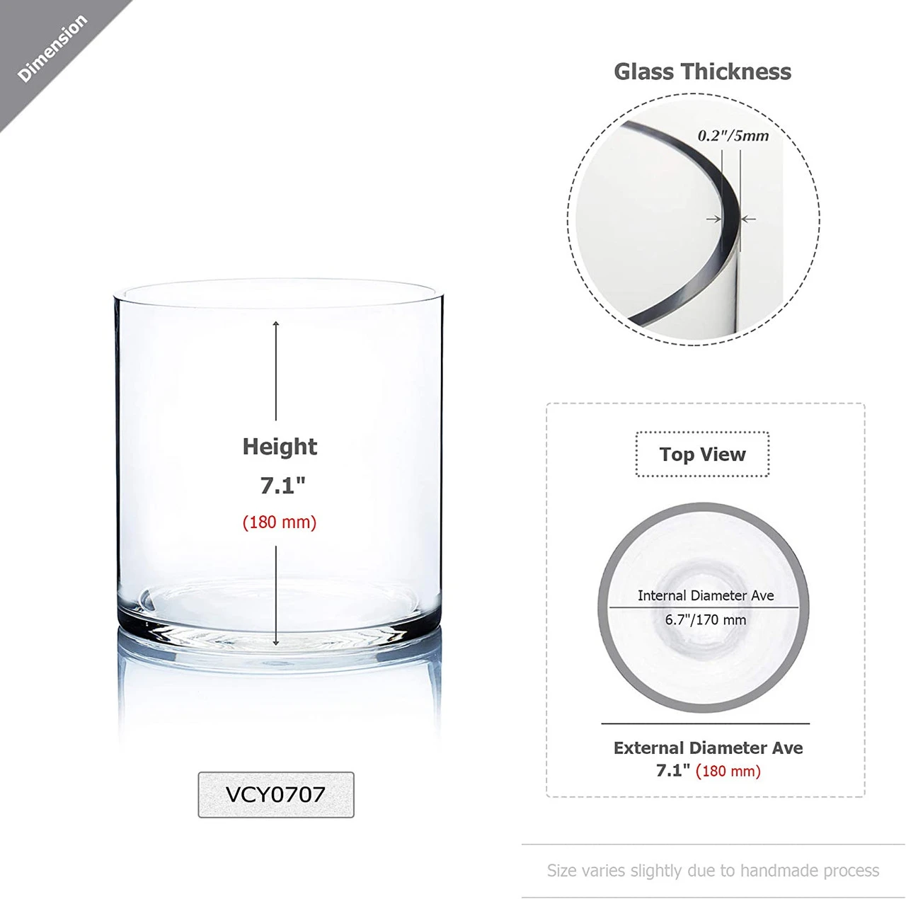 Our cylinder glass vase measures 7.25” tall with a 7” opening on top. The bottom is solid and made of clear glass to match the smooth, curved sides that surround it. A flat rim is formed on the top to create a clean edge that’s easy to handle and won’t damage delicate materials like thin fabrics.