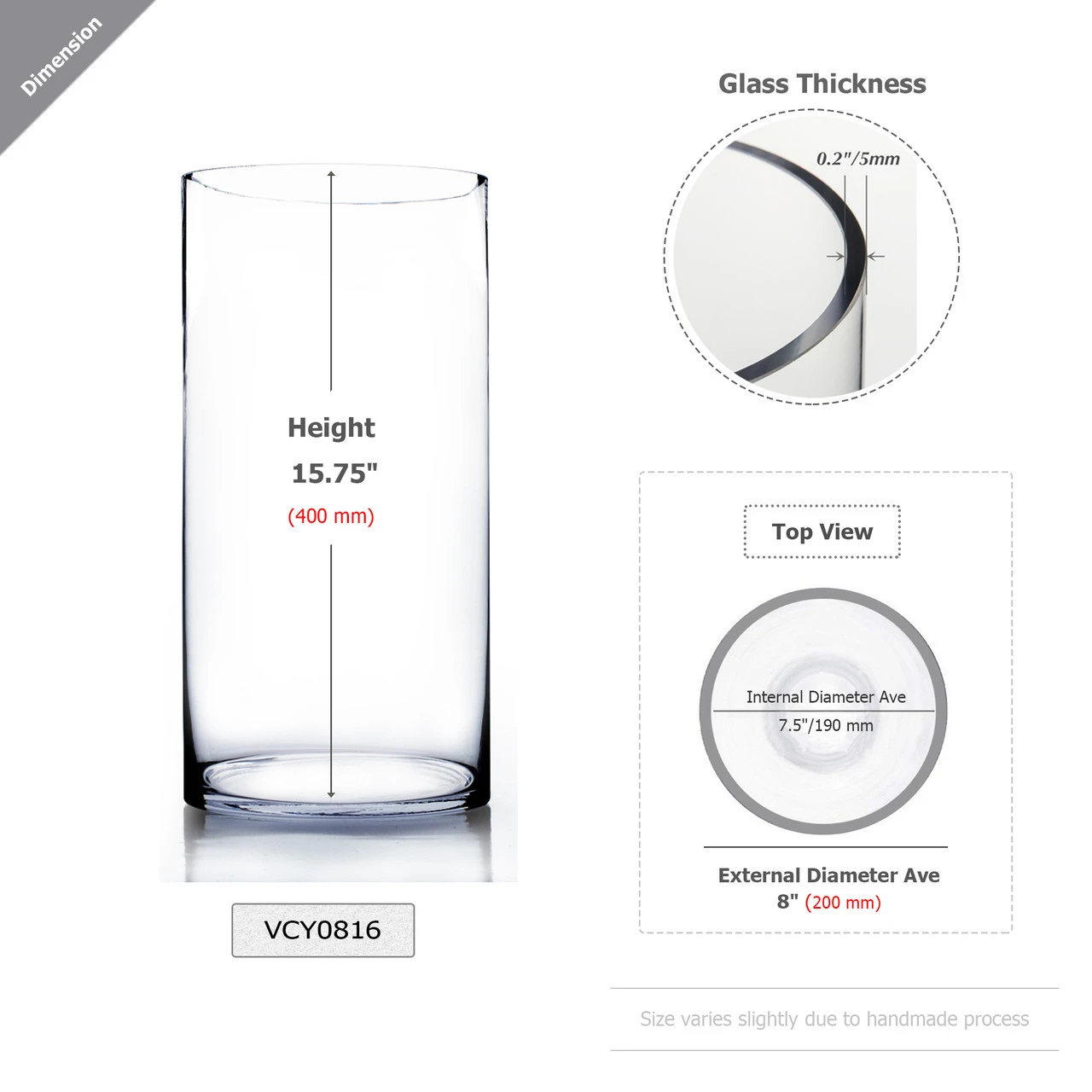 Our cylinder glass category includes a huge selection of sizes, like this larger piece. This version stands 16” tall with an 8” diameter. Each case you order contains four cylinder vases. The low case count makes it easy to purchase the quantity you want while getting a great price on your order! Glass vases in bulk is a great way to save money and still get the quality and quantity you need for an event or business.