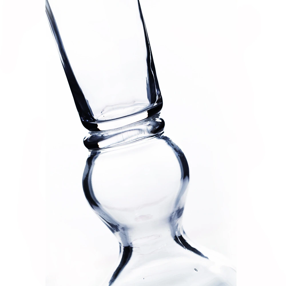 Glass rings and a short, robust neck appear just above the center, narrowing before growing into a beautiful bowl on top. The entire piece stands 23.5” tall with a classic trumpet shape that’s enhanced by the eye-catching shape of each part of this unique vase.