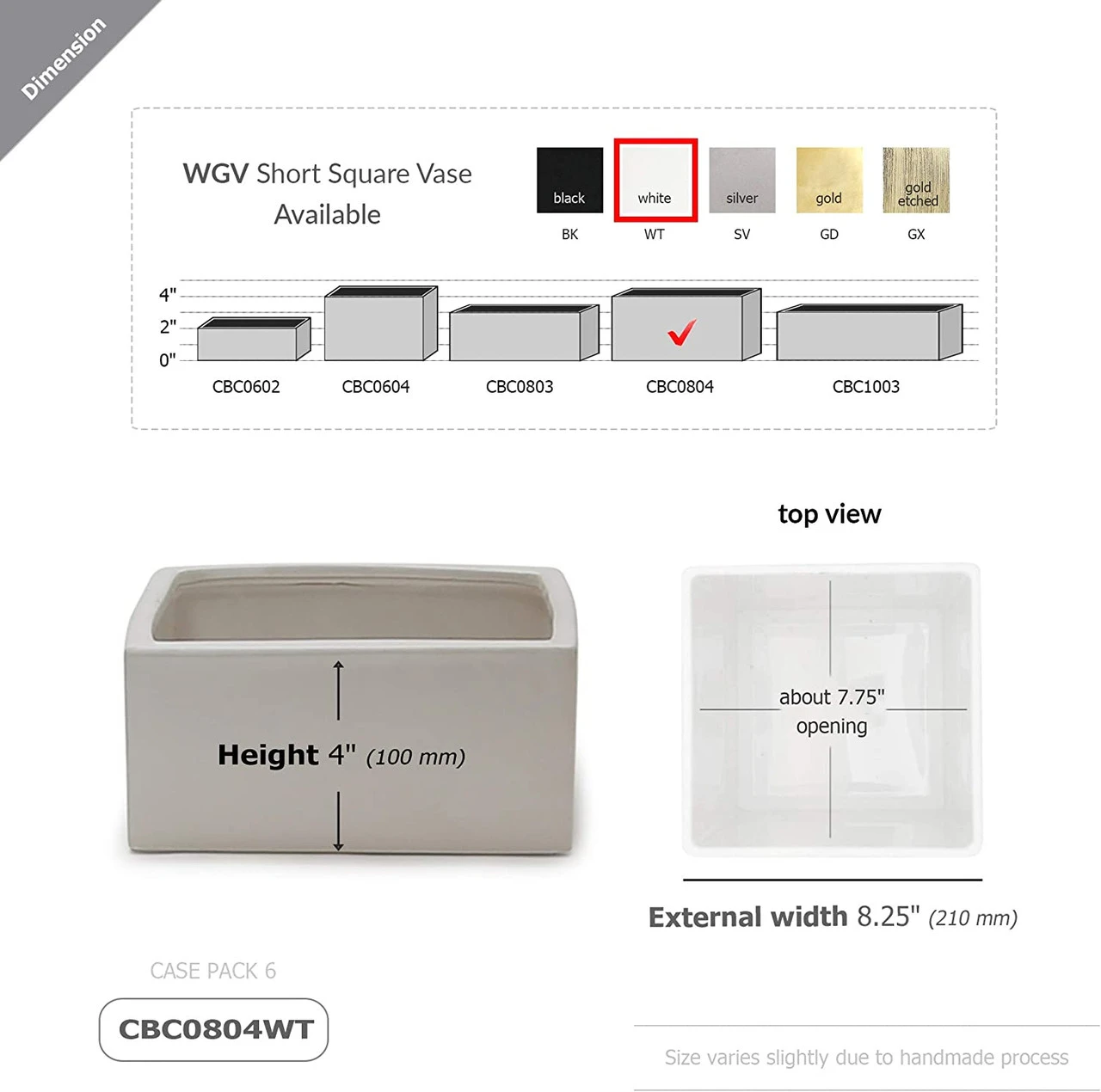 Our white low square block will become a fast favorite in your event décor collection! This simple container can be used many ways. Each box stands a total of 4 inches with an 8 inch width. The interior is open so you can fill with decorations, special mementos, and more. Our low boxes also make a great collection container when requesting notes or surveys from guests or customers. This style comes in all white so it will always match your color scheme. This item is also available in gold and black and comes in cases of six.