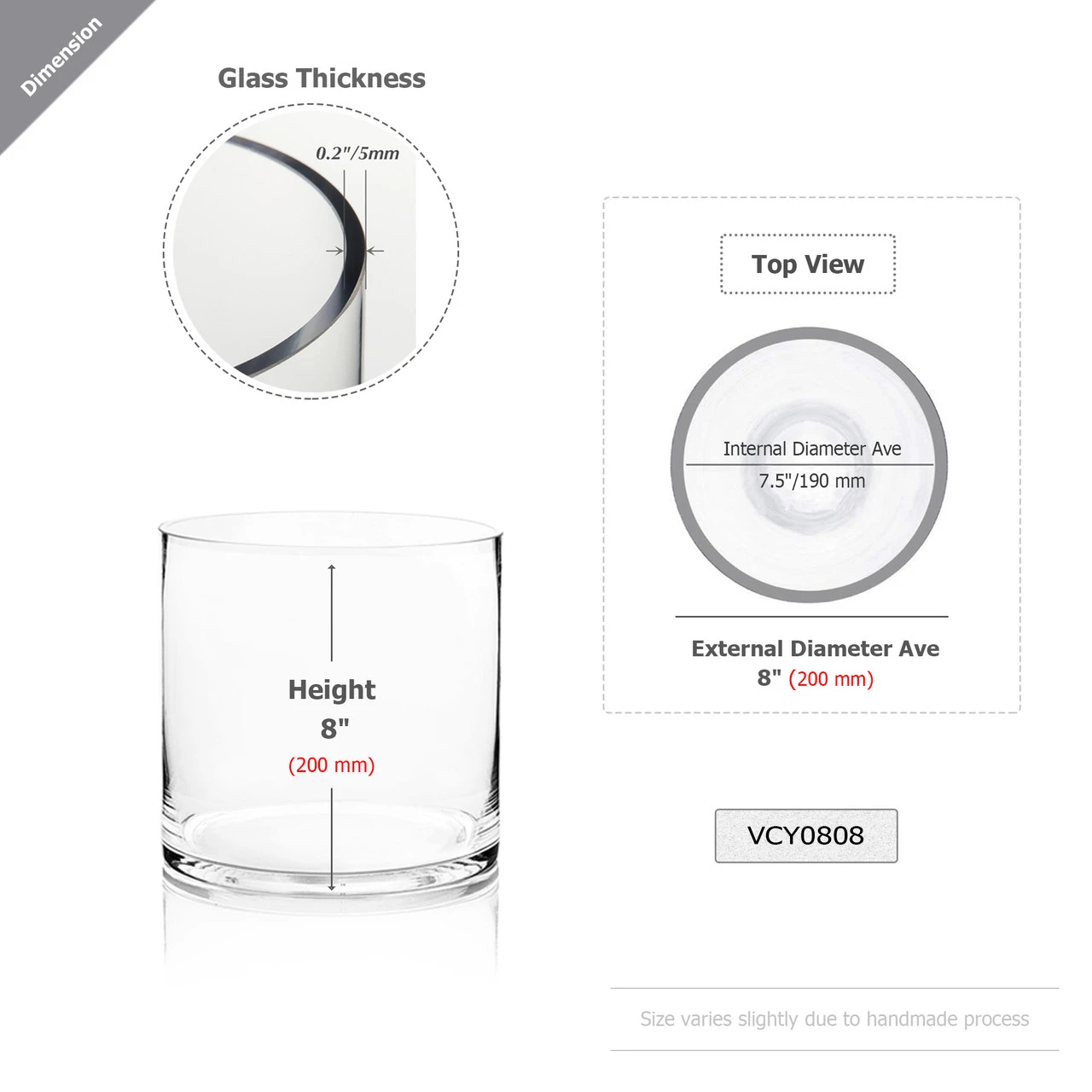 We offer a variety of glass cylinder vase sizes so you can find the perfect piece for your event. This model stands 8” with an 8” opening. Display it alone or create a fabulous wedding centerpiece or focal décor by combining our 8” glass vase with any of our other sizes. Use cylinders with a matching diameter but different height to create gorgeous arrangement. It’s easy to get that professionally designed look, even if you’re on a tight budget! Our 8” glass cylinder vase is available in case quantities of 6.