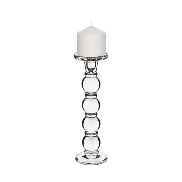 This beautiful clear bubble glass pillar candle holder is perfect for displaying wick, flameless, and LED candles. It holds a standard 3 inch diameter or smaller pillar candle. These amazing bubble glass candle holders can be placed on many surfaces for any table scapes and all types of events. Features an indented center for potential wax spillage and a slight lip to ensure candle placement.
