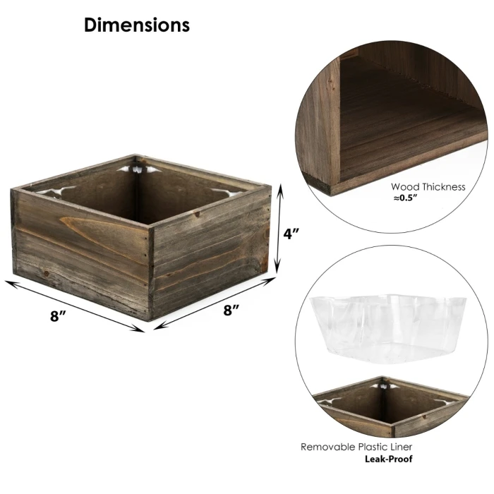Wood Square Planter Box with Plastic Liner, 8″ x 8″ x 4″
