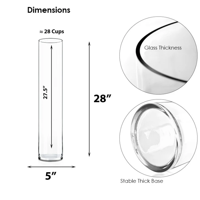 Cylinder vases are great for floral or floating candle arrangements, arts and crafts, or candle making. They make excellent centerpieces for parties and are wonderful home decor pieces. They are ideal for weddings, anniversaries, and all kinds of special occasions, especially when fresh bouquets are called for. These vases are dishwasher safe. Flowers and other accessories are not included.