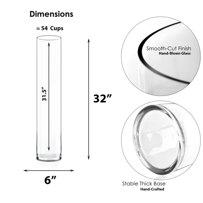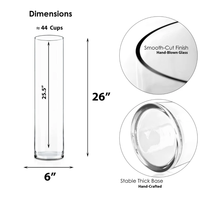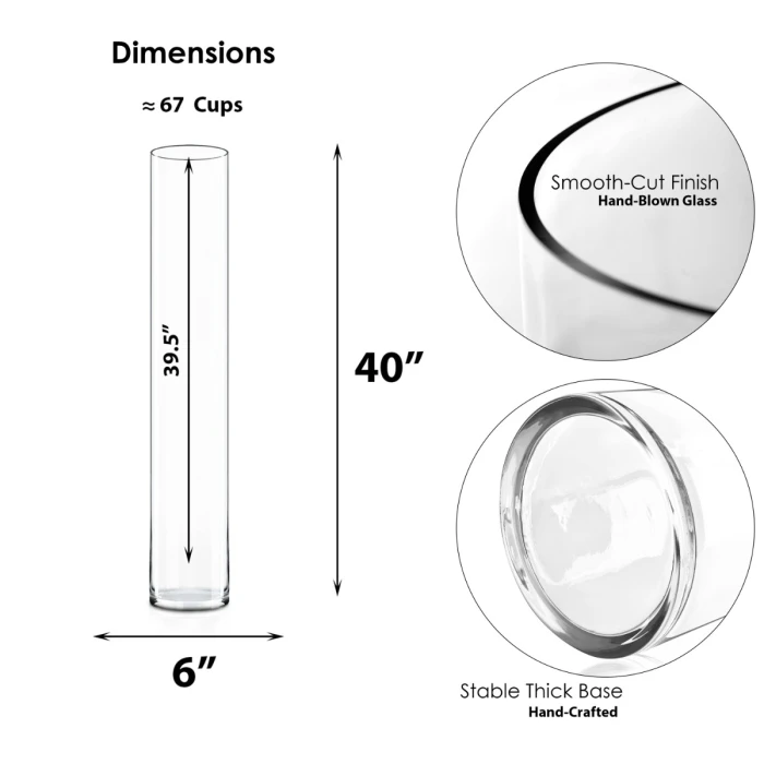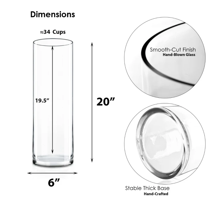 Our cylinder vases are great for floral or floating candle arrangements, arts and crafts, or candle making. They are ideal for weddings, anniversaries, and all kinds of special occasions, especially when fresh bouquets are called for. Designers can stretch their imagination to the fullest on these cylinders whether they are used as a single center piece or composing it into a cluster of cylinders of varying heights with different individual arrangements. These vases are dishwasher safe.